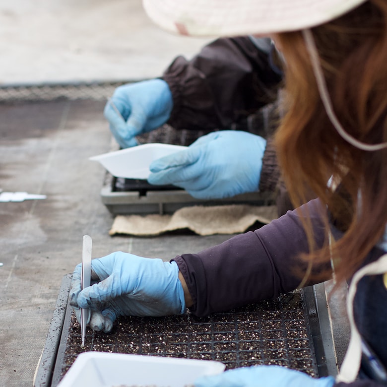 室温・日光の有無・発芽日数など個性の違う花たちを適切に管理。命が芽吹く一番小さく弱い時期だからこそ、ひとつ一つ手作業で丁寧に。